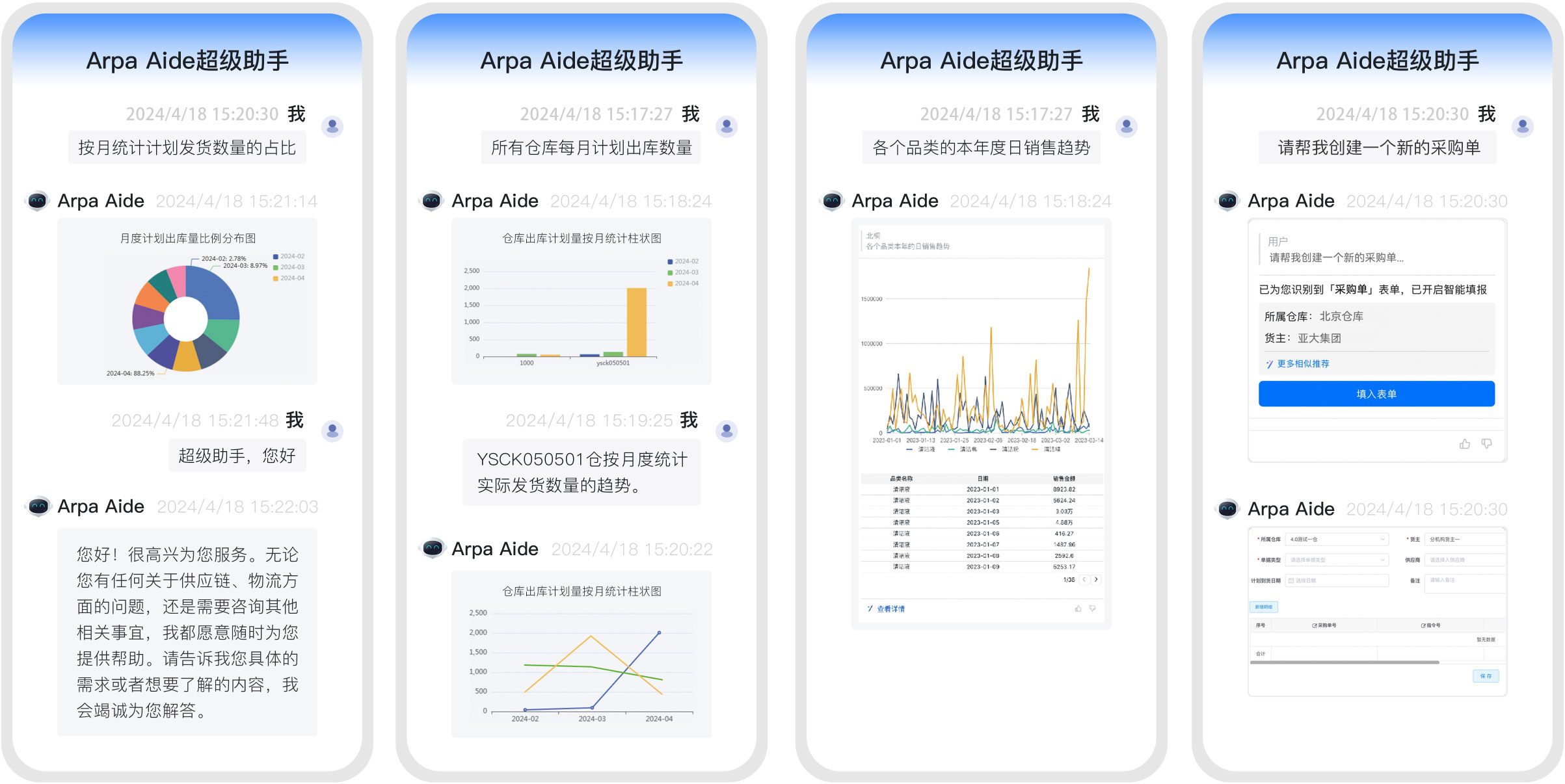 公司基于大模型研发了物流行业的Arpa Aide超级助手,形成了AI Agent智能体,包含ChatBI和ChatForm两个核心能力,ChatBI可以依据系统数据生成图表汇总,让数据分析变得更加高效和智能。借助ChatForm可以使用自然语言调出功能页面,并自动识别填入相关指令,可以大幅提升工作效率。