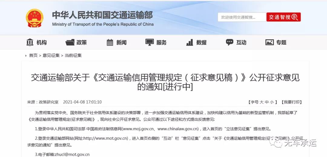 2.登录交通运输部网站(网址:http://www.mot.gov.cn),进入首页右侧的“互动”栏“意见征集”点击“关于《交通运输信用管理规定(征求意见稿)》公开征求意见的通 知”提出意见。