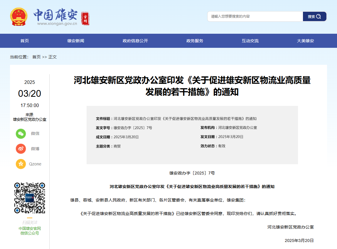 网络货运项目给予 1000 万元一次性支持,雄安新区印发促进物流业高质量发展的