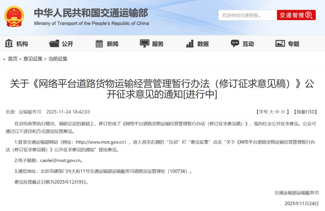 在总结政策执行情况、调研论证的基础上,修订形成了《网络平台道路货物运输经营管理暂行办法(修订征求意见稿)》,现向社会公开征求意见。公众可通过以下途径和方式提出反馈意见。